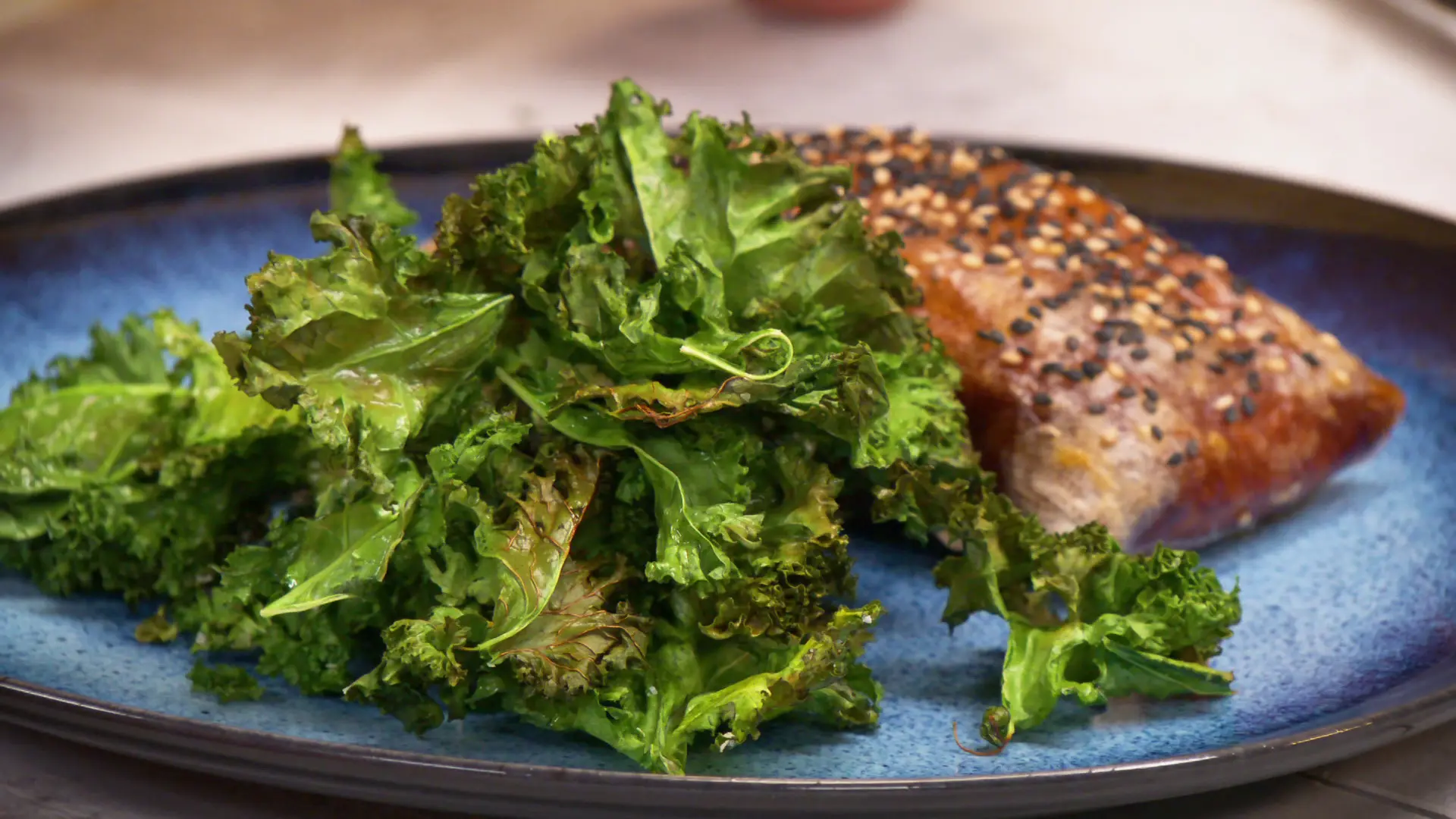Salmón en papel de arroz con chips de kale al ajillo